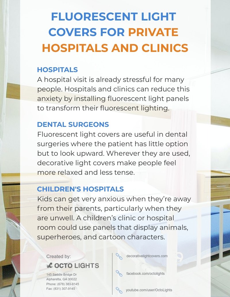 If you are interested in fluorescent light covers for your hospital, dental surgery office, or children’s clinic, call us at (678) 383-9145 for more information or use our Contact Form Here.