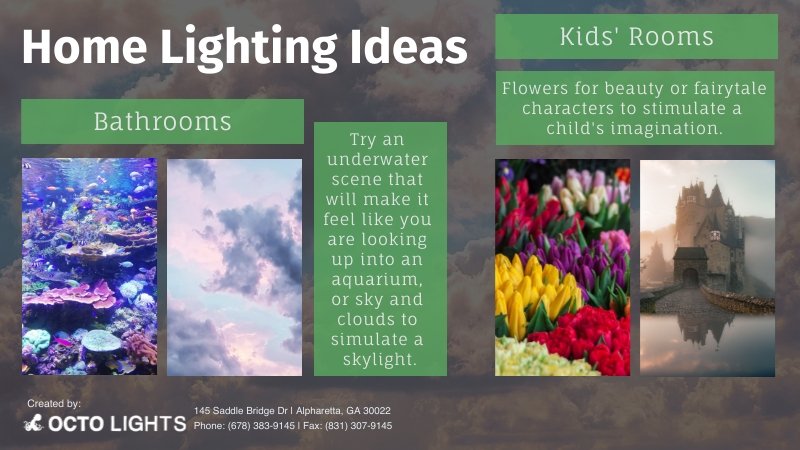 Here are some home lighting ideas using decorative light covers. First, consider the bathroom. Imagine looking up at a beautiful ocean scene—fish swimming about, and dolphins or even sharks. It is all back-lit and entirely lifelike, as though you were looking up from the bottom of a crystal clear ocean. Or perhaps a beautiful tranquil beach scene, or you can use sky-and-cloud panels to give you the impression of a beautiful sunny sky above you.